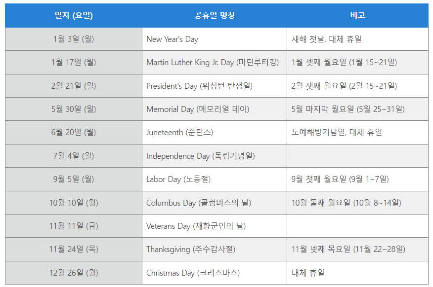 미국 증시 휴장일을 알아보기 전에 먼저 미국 공휴일에 대해서 알아둘 필요가 있습니다. 미국 연방에서 인정하는 공휴일(Federal Holidays)은 1년 중 총 12번이 있는데요. 만약 연방 공휴일이 토요일에 겹치면 직전 금요일로, 일요일에 겹치게 되면 직후 월요일로 대체 휴일이 지정됩니다.